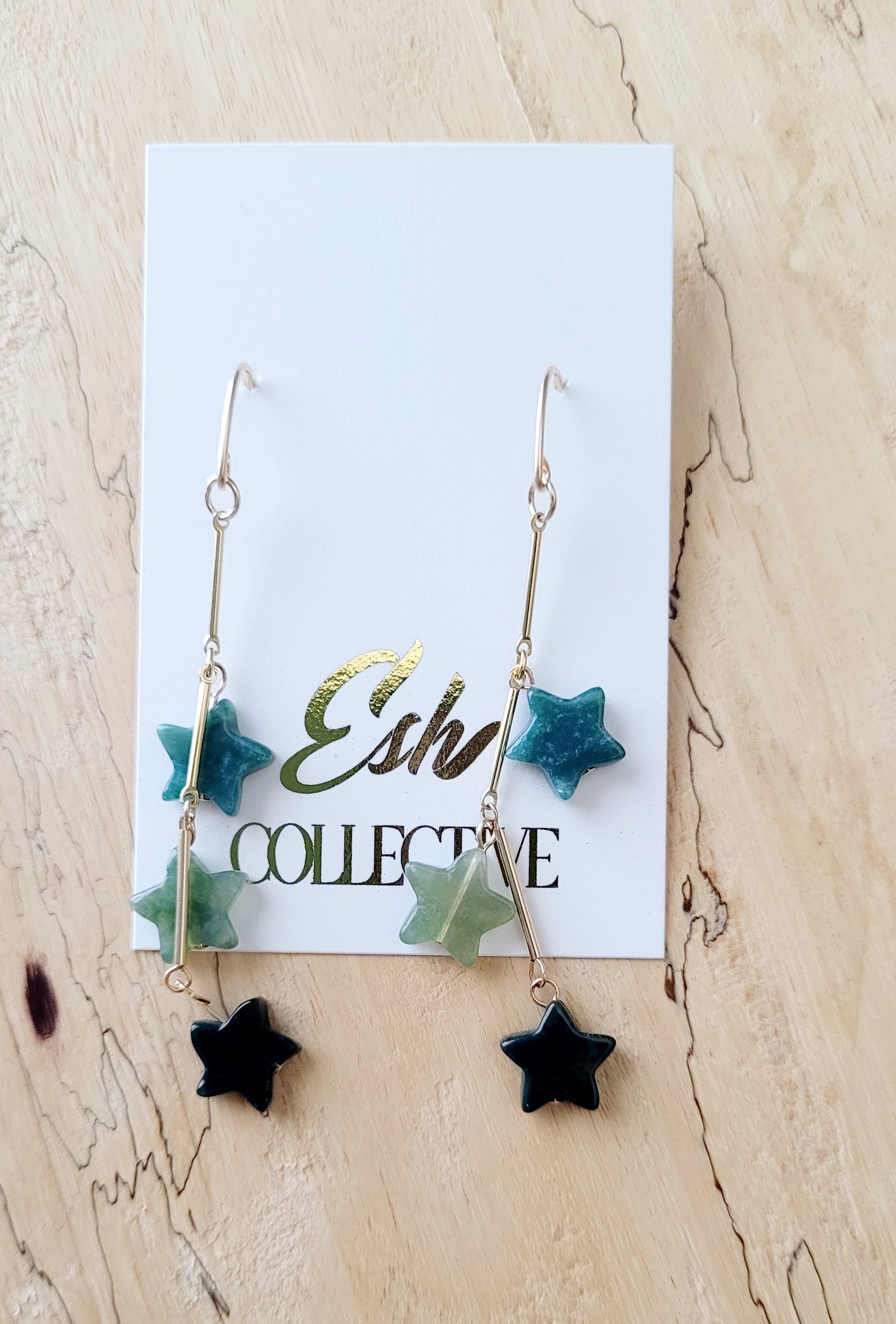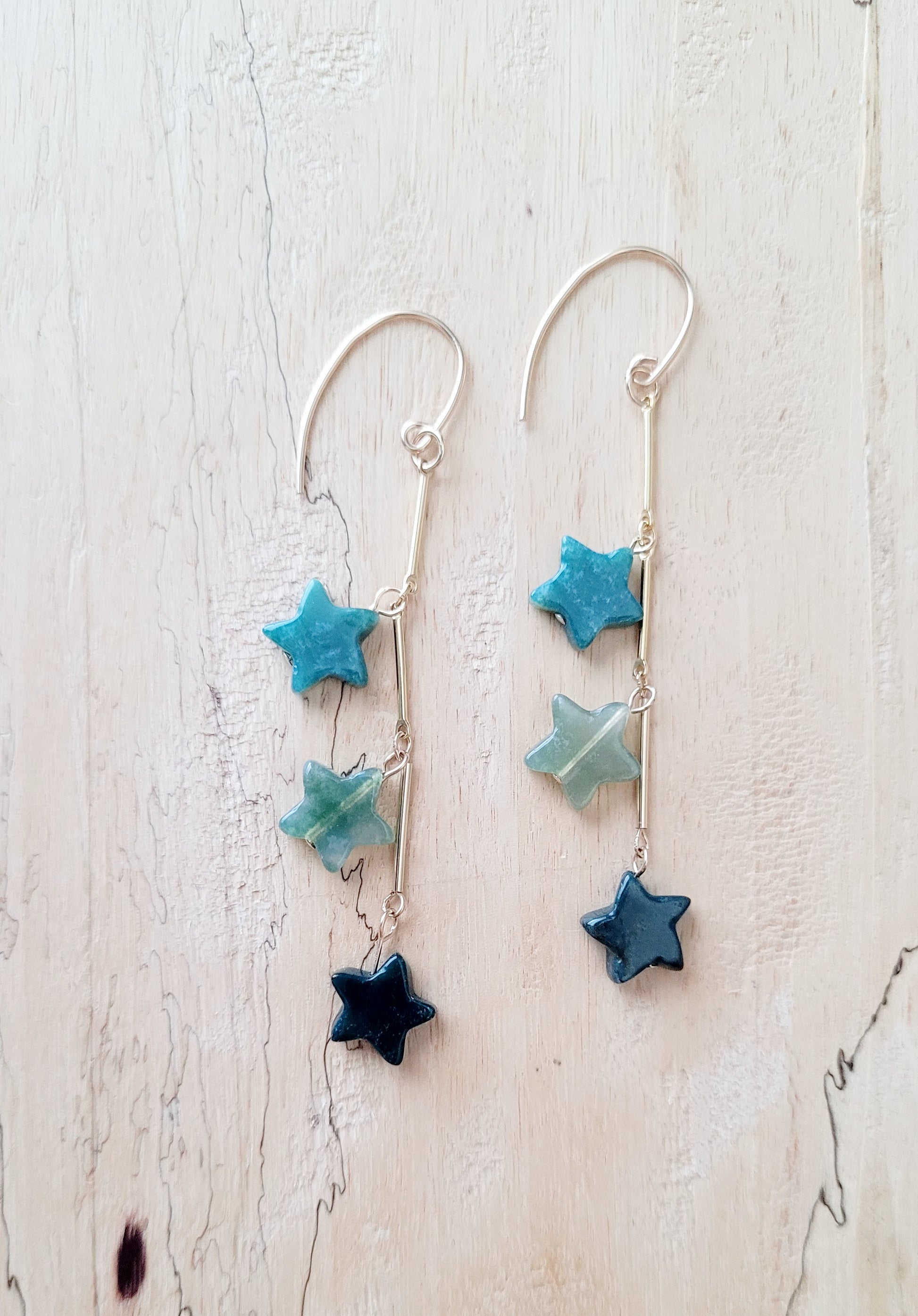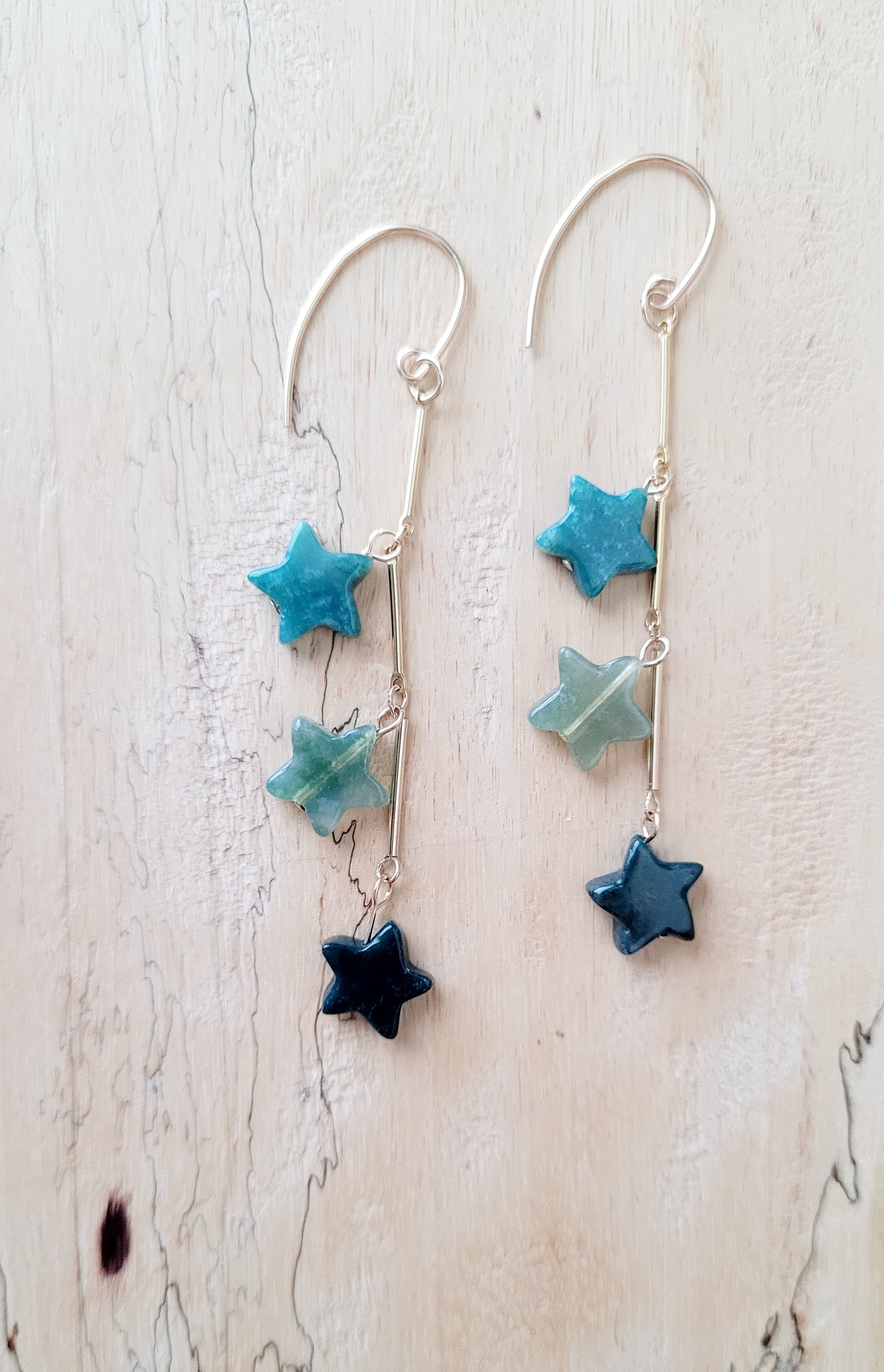 Agate shooting star earrings are so much fun. These lovely earrings and made from Indian Agate and 14k gold filled parts. Earrings measure 3 inches long.