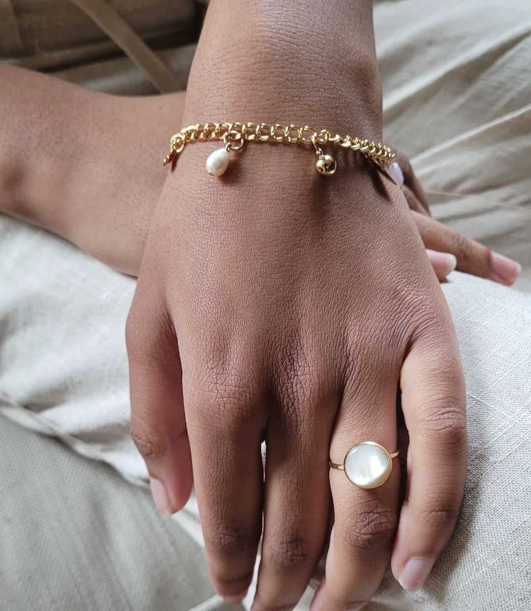 Charm bracelet with blue lace agate is beautiful. This whimsical charm bracelet can match the pearl and agate pieces listed in the collection. Made from 14k gold chain and parts. Semiprecious stones and beads. Bracelet measures 7 inches long.