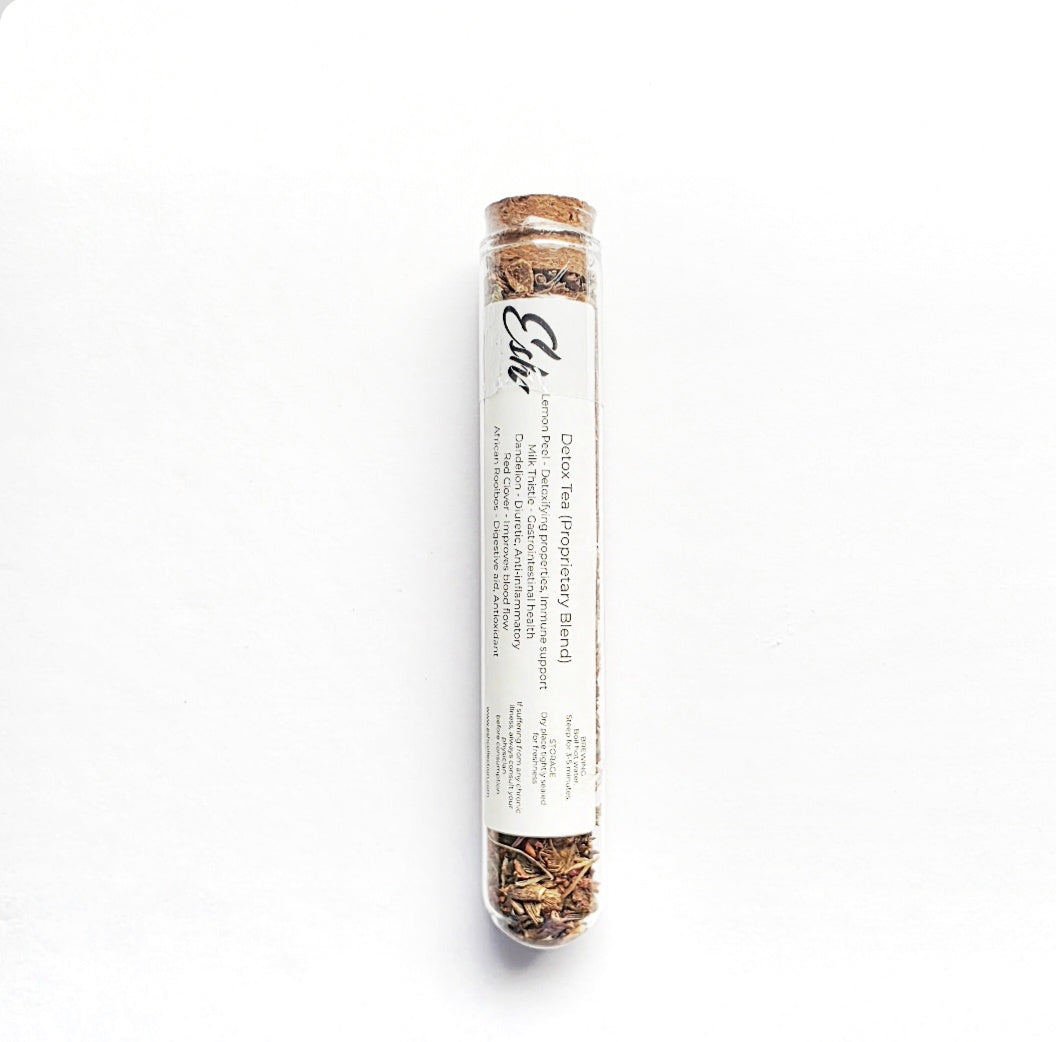 Detox tea is a remedy based blend of organic herbs and botanicals. Detox tea helps to remove impurities from your body. Herbs are blended with African rooibos to give it a good taste.Tea is packaged in a 2 ounce test tube for freshness. tube is reusable.