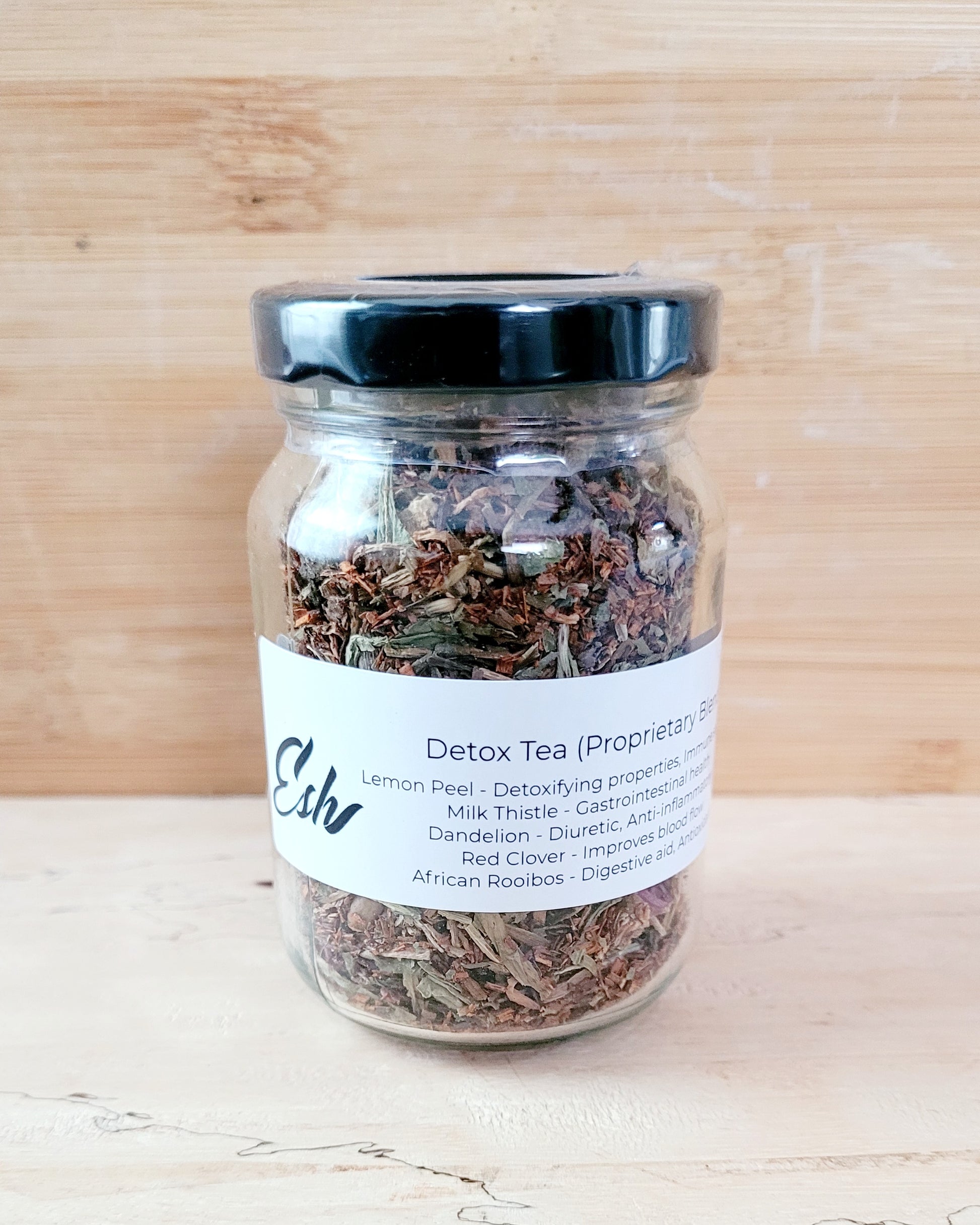 Detox tea is a remedy based blend of organic herbs and botanicals. Detox tea helps to remove impurities from your body. Herbs are blended with African rooibos to give it a good taste. Tea is packaged in a 4 ounce glass jar for freshness. Jar is reusable.