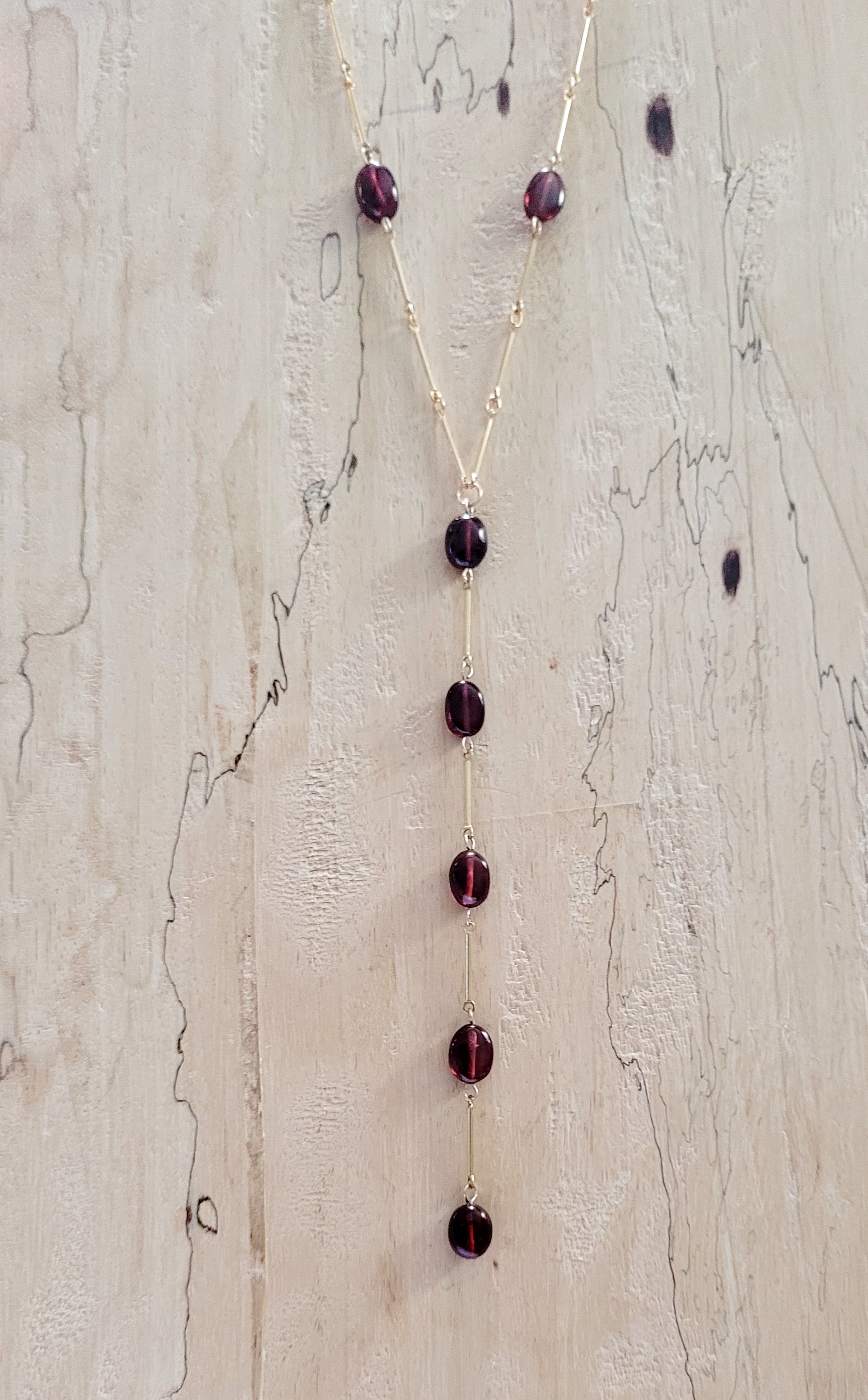 Garnet and gold lariat necklace is an elegant piece. Made from 14k gold filled tube chain and garnet stones. The necklace measures 24 inches. The lariat extends an additional 4 inches.