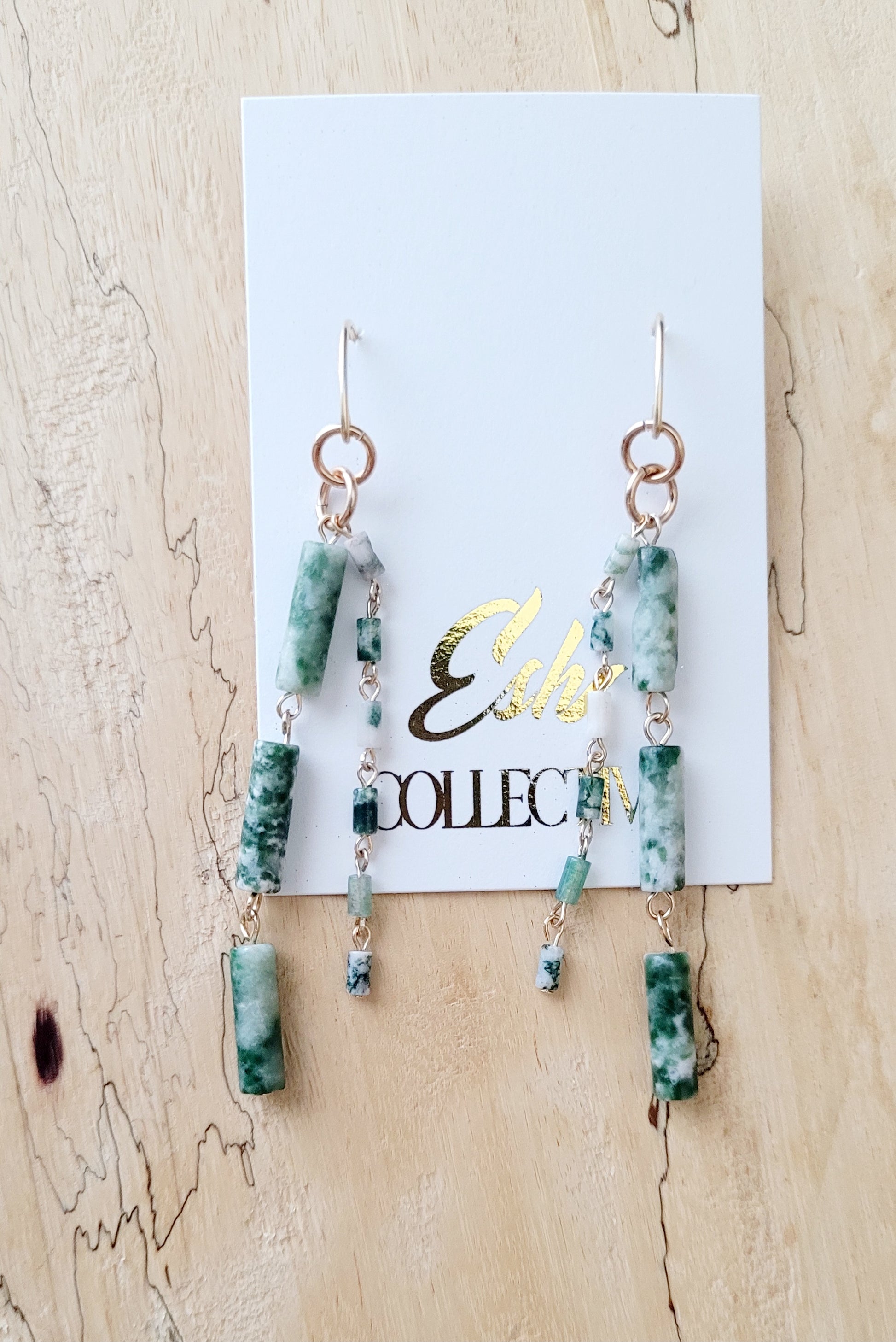 Tree agate drop earrings are stunning. These beautiful handcrafted earrings are made from 14k gold filled findings and top quality moss agates. Earrings are not heavy and measure 3 inches long.