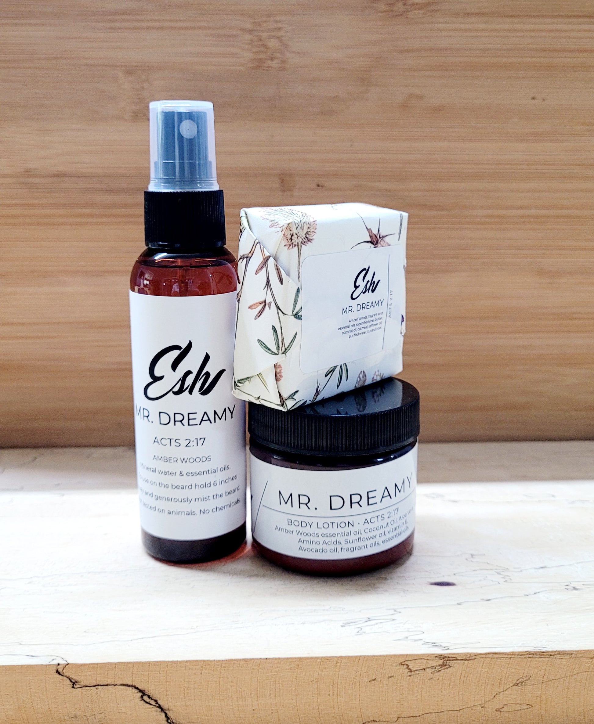 Mr dreamy, Amber woods travel set is wonderful. The includes a spray that can be used on your body, beard on your sheets or in your car. Emollient lotion and a moisturizing bar of soap. All products are approved travel size.