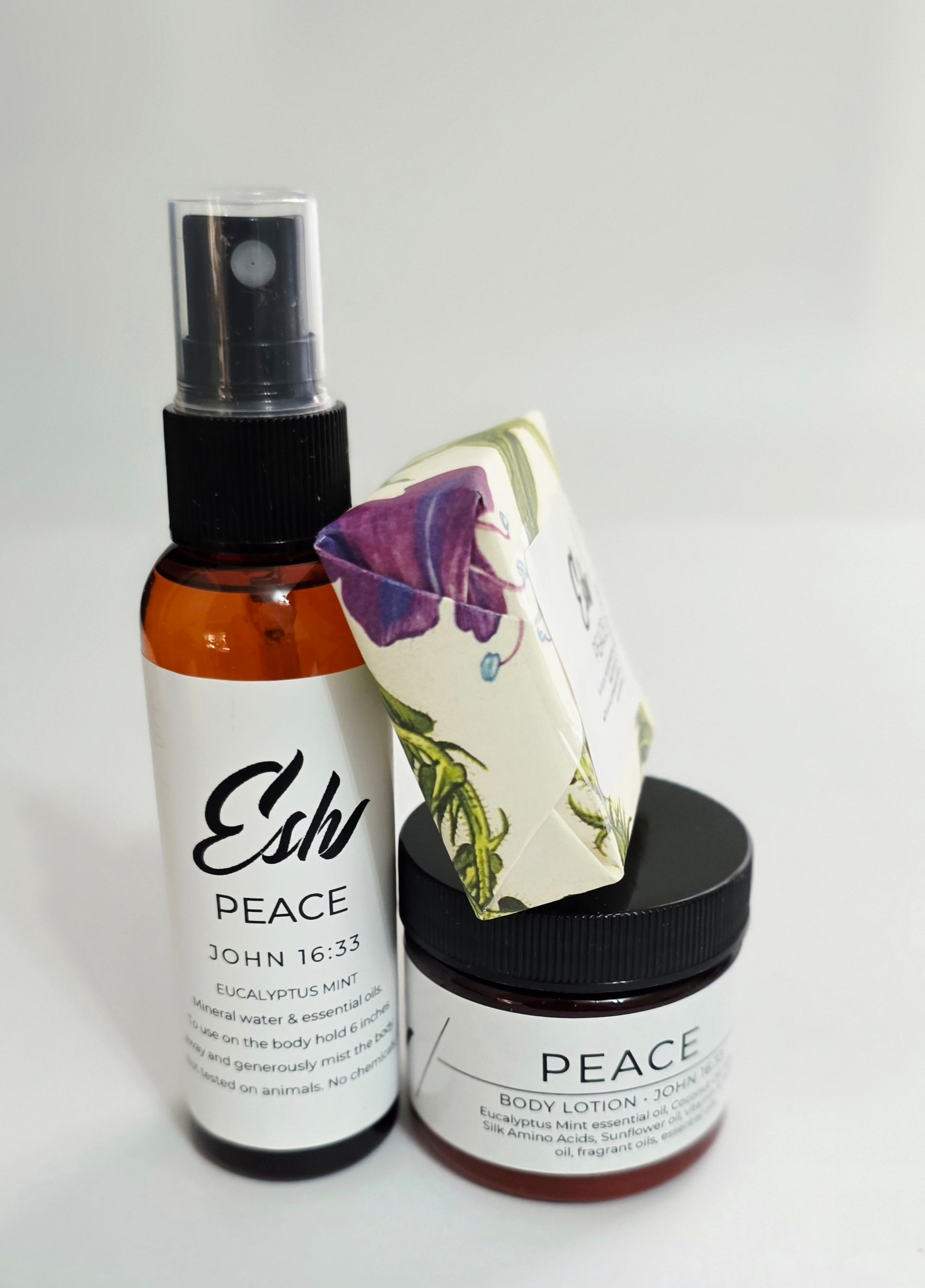 Peace, eucalyptus mint travel set is wonderful. The includes a spray that can be used on your body, on your sheets or in your car. Emollient lotion and a moisturizing bar of soap. All products are approved travel size.