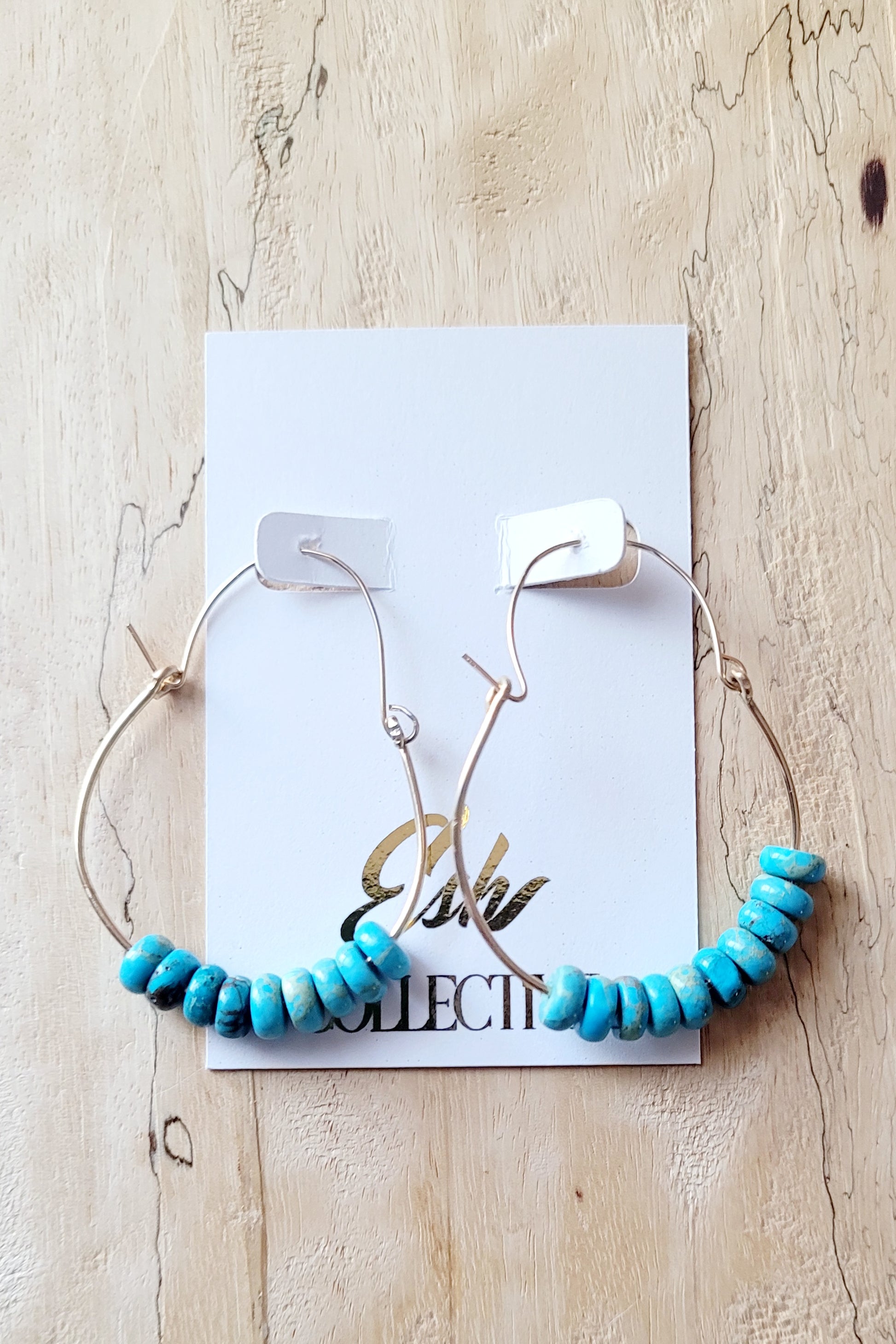 Turquoise and gold hoop earrings are a beautiful addition to any collection. These beauties are made from 14k gold filled parts and AAA turquoise. Earrings measure 2 inches long. These are a medium size earring.